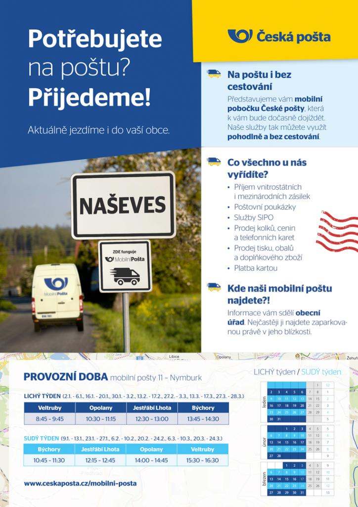 Do obce bude dojíždět, dle rozpisu, Mobilní služba České pošty k Obecnímu úřadu Jestřabí Lhota.