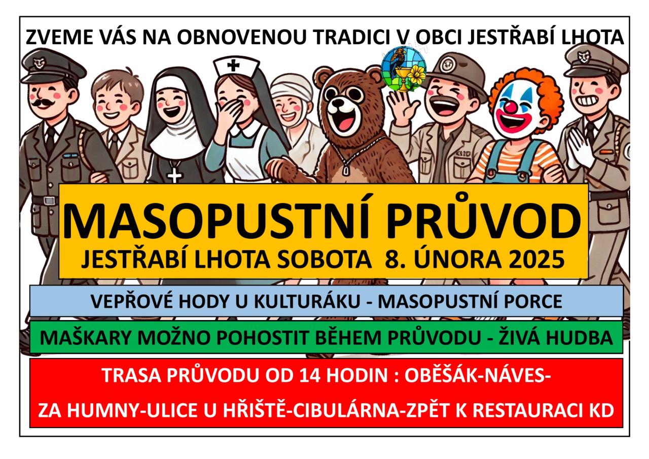 Zveme vás na masopustní průvod v obci Jestřabí Lhota, který se koná v sobotu 8. února 2025. Trasa průvodu začíná ve 14 hodin a vede přes Oběšák, náves, Za Humny, ulici U Hřiště, Cibulárnu a zpět k restauraci KD. Během průvodu je možné pohoštění maškar. Vepřové hody u kulturního domu s masopustními porcemi. Průvod i následné hody bude doprovázet živá hudba.