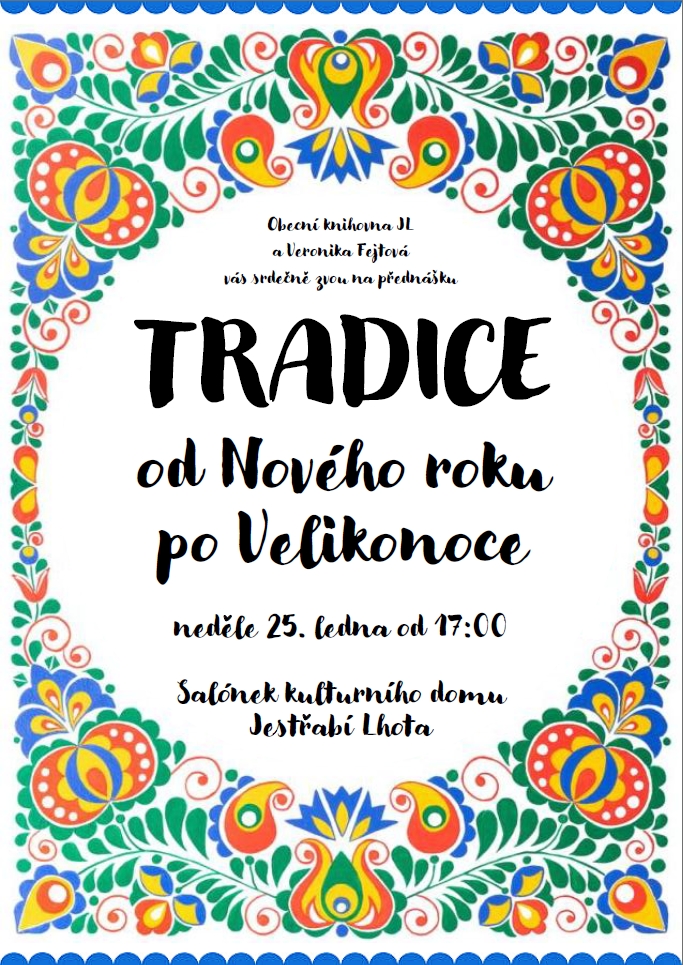 Obecní knihovna Jestřabí Lhota a Veronika Fejtová zvou všechny zájemce na přednášku o tradicích, která se bude konat v neděli 25. ledna od 17:00. Přijďte se dozvědět více o zvycích a obyčejích, které se dodržují od Nového roku po Velikonoce. Tato akce se uskuteční v salónku kulturního domu v Jestrabí Lhotě, kde se můžete těšit na zajímavé informace a diskusi s dalšími účastníky.