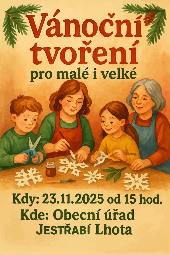 Zveme vás na Vánoční tvoření, které se koná v neděli 23. listopadu 2025 od 15:00 na Obecním úřadě v Jestřabí Lhotě. Přijďte si vytvořit zimní dekorace a ozdoby, užít si společné odpoledne a naladit se na Advent. Přineste si dobrou náladu a klidně i vlastní nápady. Akce je určena pro všechny věkové kategorie, neváhejte a vezměte s sebou své kamarády či prarodiče.